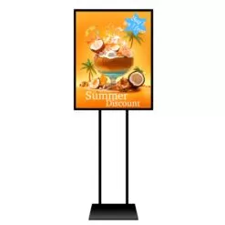 Our floor standing sign stand is 60″ high and accommodates a 22″ x 28″ drop inserts of any type of sign board 0.25″ thick or less. This sign holder is perfect for retail advertising, commonly seen in front or mid-store.